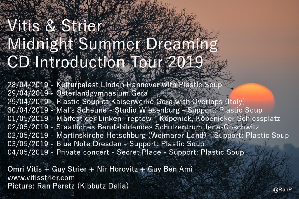 Als Akustik-Duo spielen Omri Vitis und Guy Strier seit 2015 zusammen. Im Herbst 2016 waren sie erstmals auf Tour in Deutschland. Bei zwölf Konzerten in Thüringen, davon sechs in Gymnasien, begeisterten sie mit ihrem Debütalbum „Waterfall“. Es folgten vier weitere erfolgreiche Tourneen in den vergangenen zwei Jahren. In Berlin, Sachsen, Mecklenburg-Vorpommern, Brandenburg und immer wieder auch in Thüringen eroberten die Israelis die Herzen zahlreicher Musikbegeisterter. Markenzeichen ihres Sounds sind der spannende Mix aus E- und Akustik-Gitarre, Omris berührender Gesang und Guys kraftvolle Mundharmonika. Vitis‘ Texte erzählen Momente seines Lebens. Sie sind ebenso ehrlich, authentisch und klar wie der Sound des Duos, ob live oder von der Konserve. Momentan ist das zweite Album der Band in Arbeit. Wenn sie auf der Bühne stehen, ist der Altersunterschied von 19 Jahren zwischen den beiden Musikern kaum zu spüren, ja vielleicht sogar einer der Gründe für ihr breites Publikum. Vitis & Strier fühlen sich in kleinen Clubs, Cafés oder Musikbars ebenso wohl wie auf Festivalbühnen, in Kirchen, Synagogen oder Konzertsälen. Auch als Wohnzimmermusiker sind sie bereits mehrfach in Erscheinung getreten. Gern kommen sie auch zu euch.