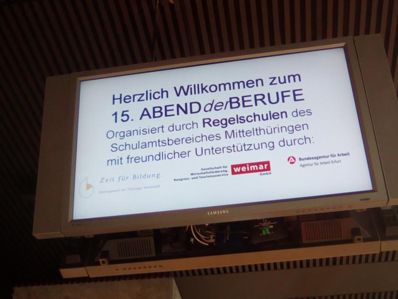 Zum 15. Mal – leider zum letzten Mal in dieser Form – fand in Weimar der „Abend der Berufe“ statt. Wir präsentierten unsere Möglichkeiten für Ausbildung und Schul­ab­schlüsse. In bewährter Form beantworteten wir, Herr Dr. B. Streibhardt (Mitglied im FV) und Frau Streibhardt die Fragen der jungen Menschen und deren Eltern.