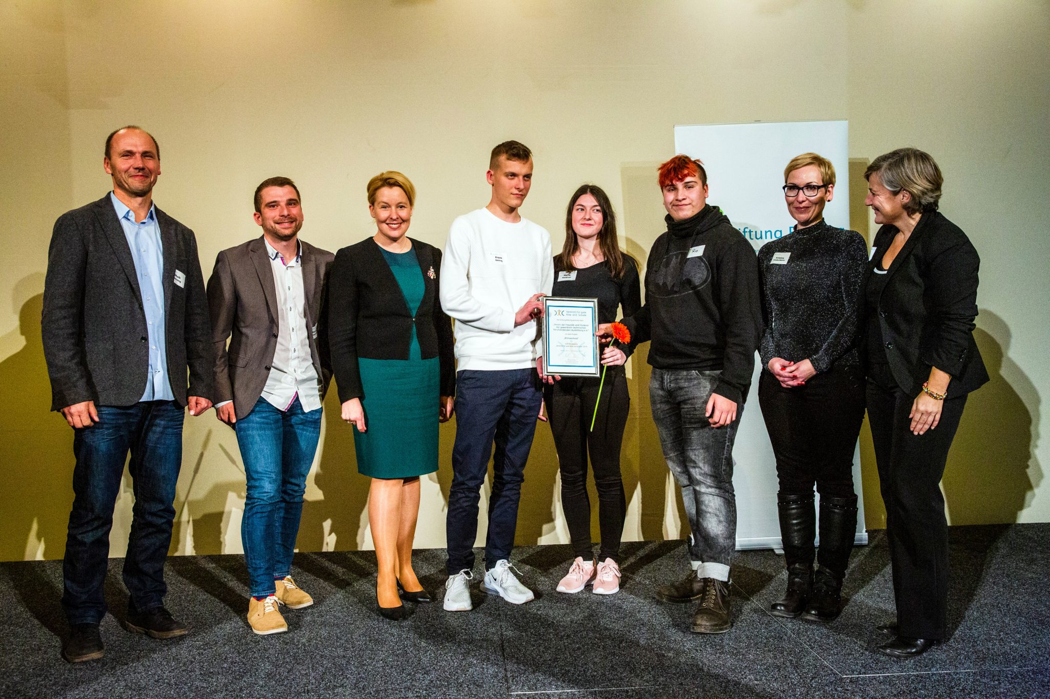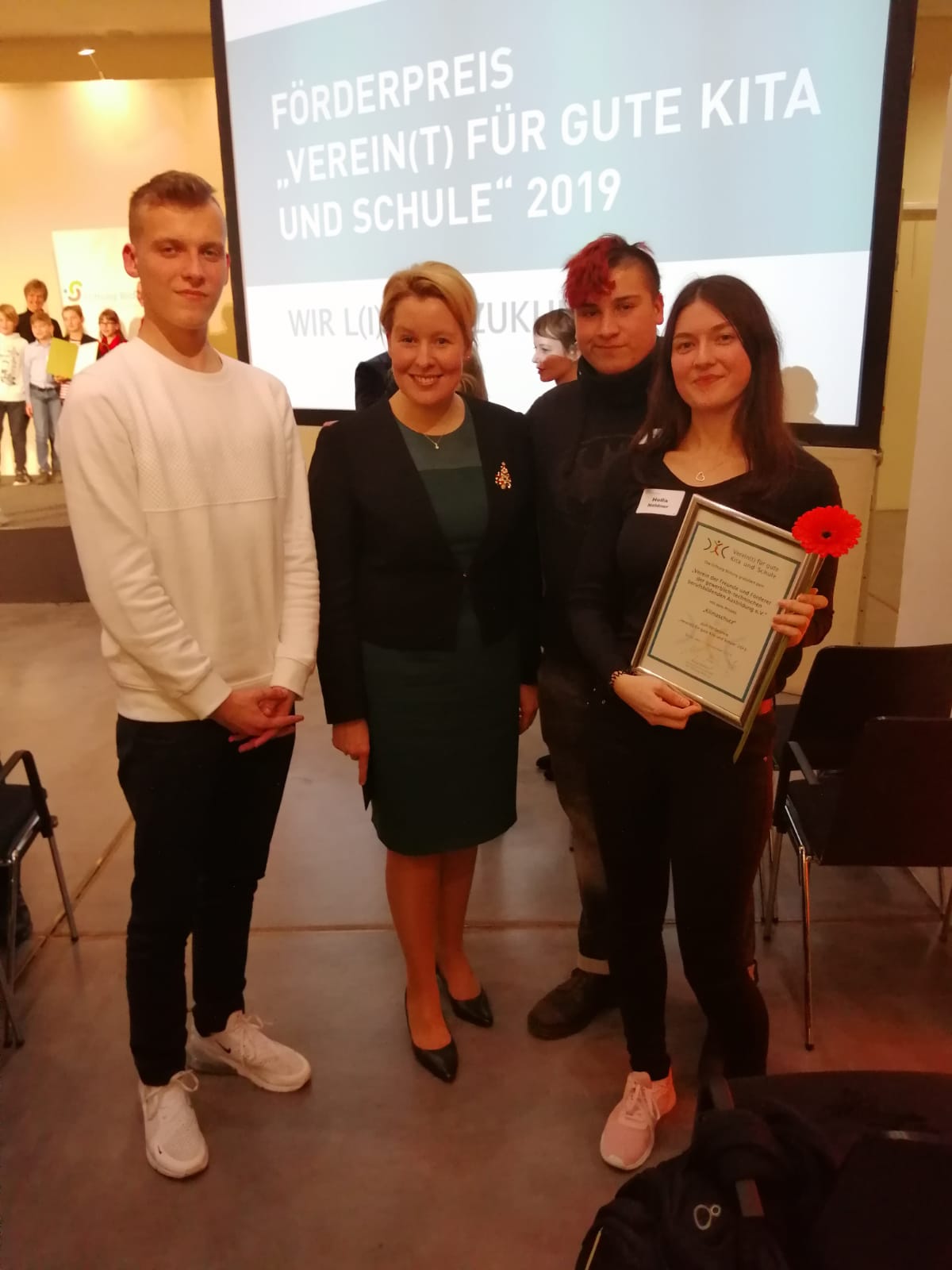 Auf der Festveranstaltung der Stiftung Bildung am 11.Dezember 2019 im Umweltforum in Berlin sind die Schüler der beiden Klassen für ihre Leistungen mit einem der drei, mit 5000 € dotierten, Preise ausgezeichnet worden. Stellvertretend für ihre Mitschüler nahmen Hella Neldner, Franz Göring und Rio Streipert sowie Herr Fechler und Herr Sterzing, als Klassen- und Fachlehrer, den Preis in Empfang. Besondere Würdigung erfuhren die Preisträger durch die Laudatio der Bundesministerin für Familie, Senioren, Frauen und Jugend, Dr. Franziska Giffey, die auch den Preis überreichte.