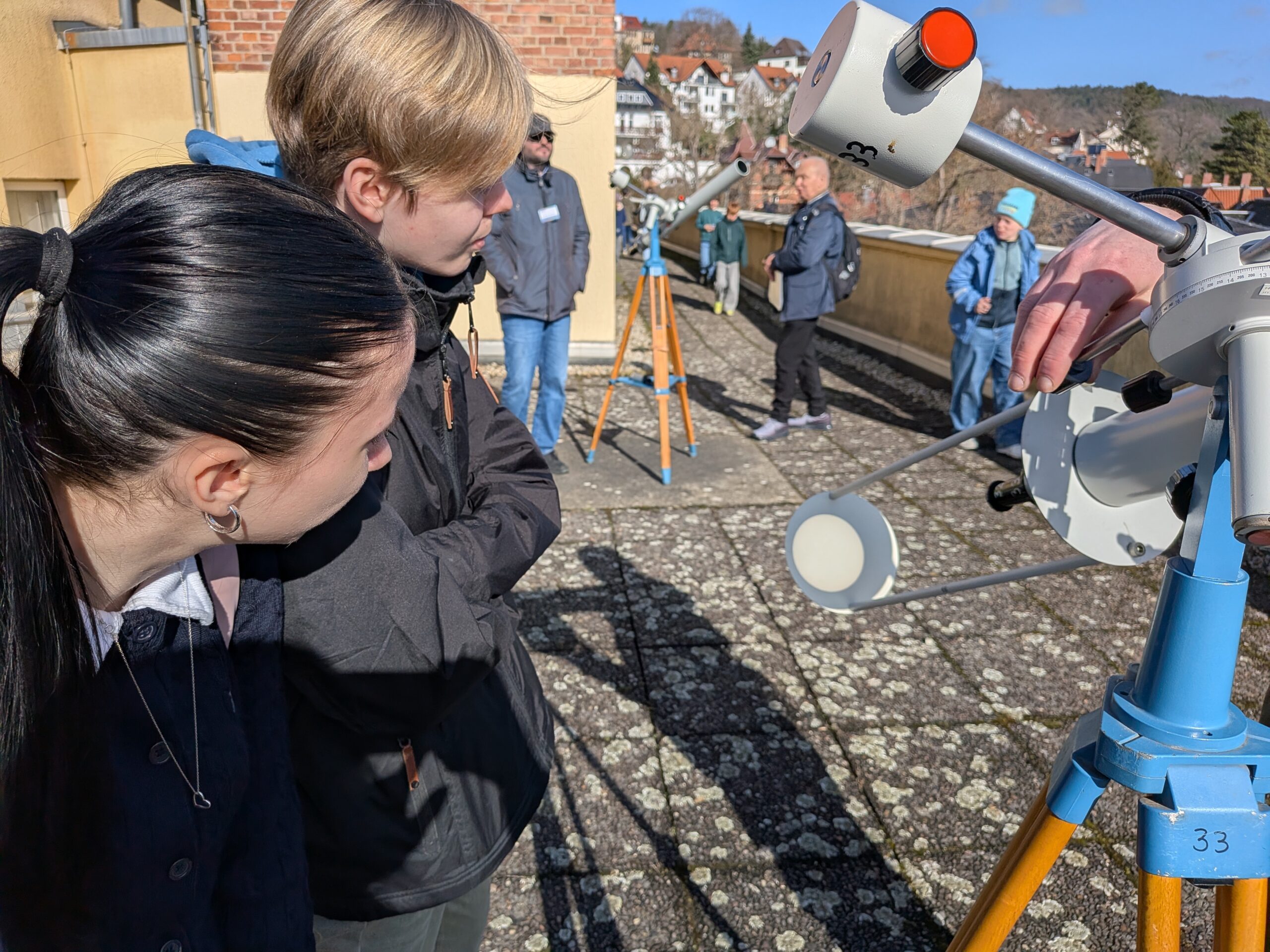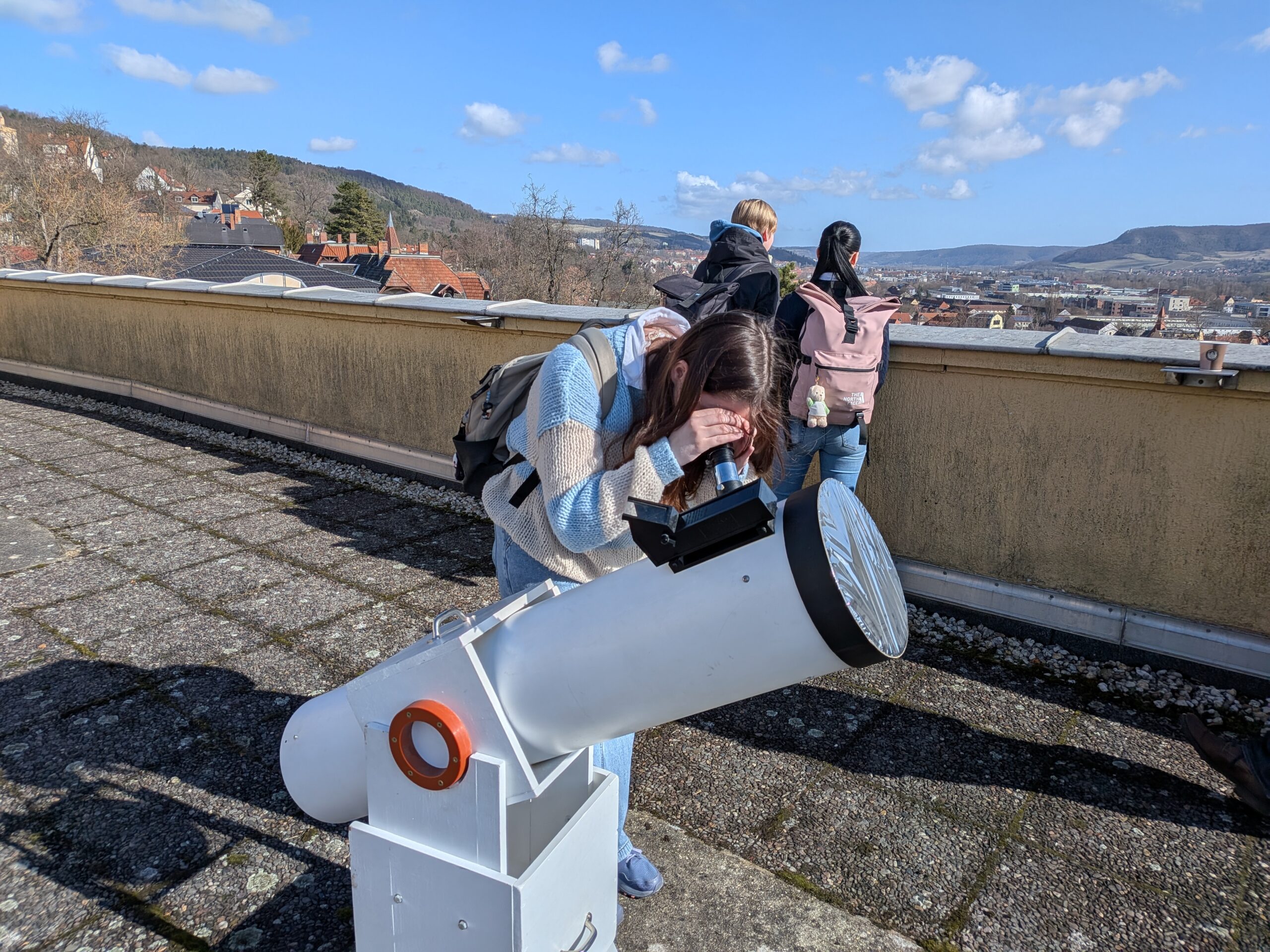 Beim schönsten sonnigen Wetter nutzten die Auszubildenden aus dem Fachbereich Feinoptik die Möglichkeit auf dem Dach der Physikalisch- Astronomischen Fakultät die Sonne hautnah zu beobachten. Auf dem Dach waren vier verschiedene Teleskope aufgebaut, um die Sonne mit ihren schwarzen Sonnenflecken wandern zu sehen. Unglaublich, dass die diese kleinen schwarzen Pünktchen auf der Sonne, wie wir sie durch das Teleskop betrachten, so groß wie unsere Erde sind.