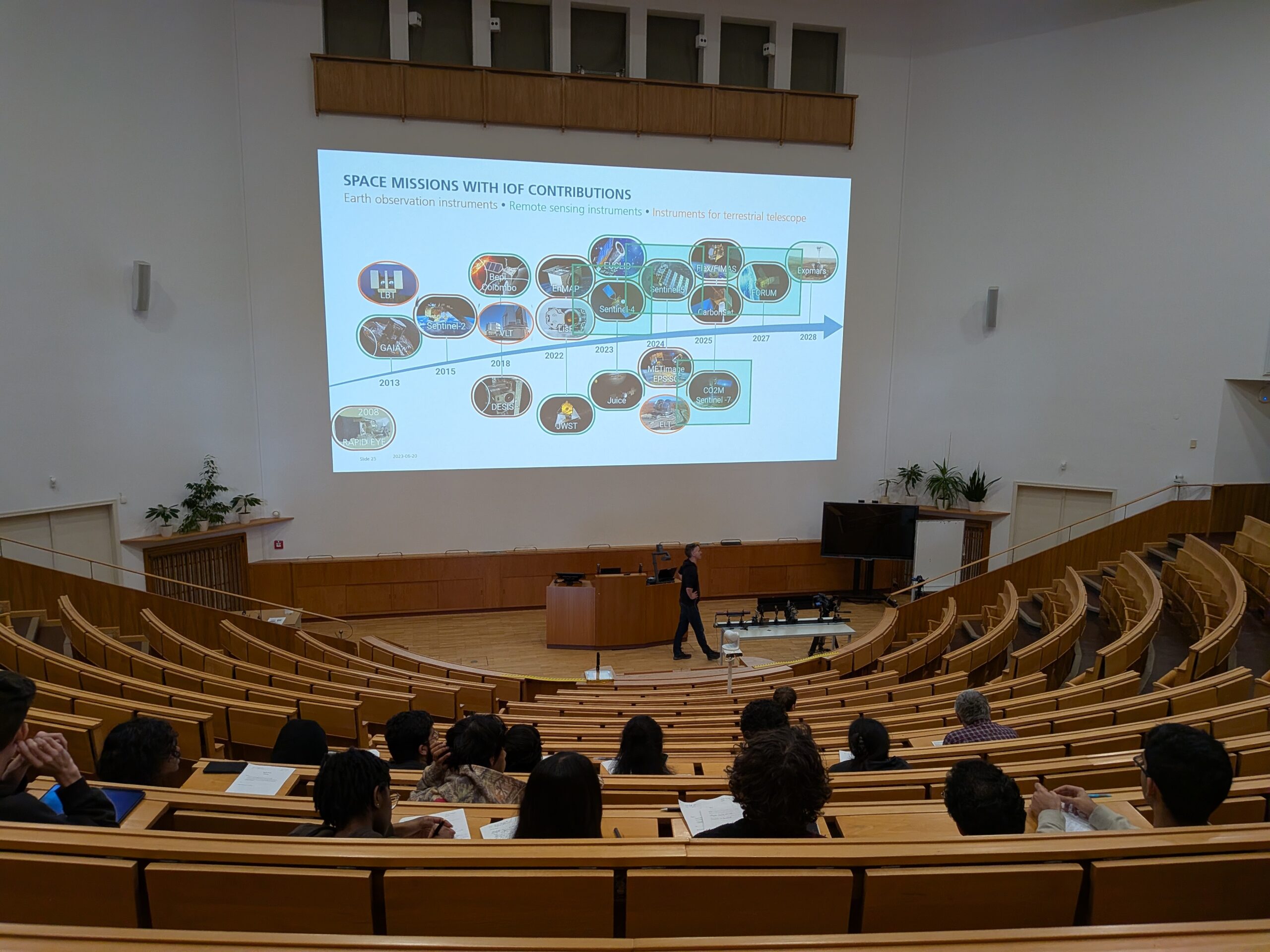 Besonders spannend fanden wir die Vorlesung „Schrottbeseitigung im Weltall mit Hilfe von Lasern im großen Hörsaal. Der Hörsaal selbst, der trichterförmig aufgebaut ist, ist schon beeindruckend.